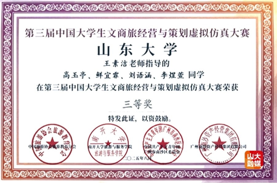 近日,第三届中国大学生文商旅经营与策划虚拟仿真大赛决赛在广州举行,山东大学管理学院学生团队在此次比赛中获得三等奖。