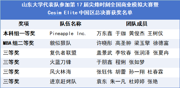 3月28日至30日,第十七届尖烽时刻全国商业模拟大赛总决赛在北京师范大学举行,来自全国的109支队伍一决高下,在虚拟环境中运用所学知识解决真实商业活动中的各类问题,展现商业决策能力。在本届赛事中,山东大学本科“Pineapple Inc.”荣获全国一等奖,山东大学MBA“貌似狠队”荣获全国二等奖,山东大学MBA“复仇者联盟”“风火林海”“进京赶烤”与山东大学研究生“火蓝刀锋”等四支队伍荣获全国三等奖。管理学院包春兵教授荣获“优秀指导教师”荣誉。