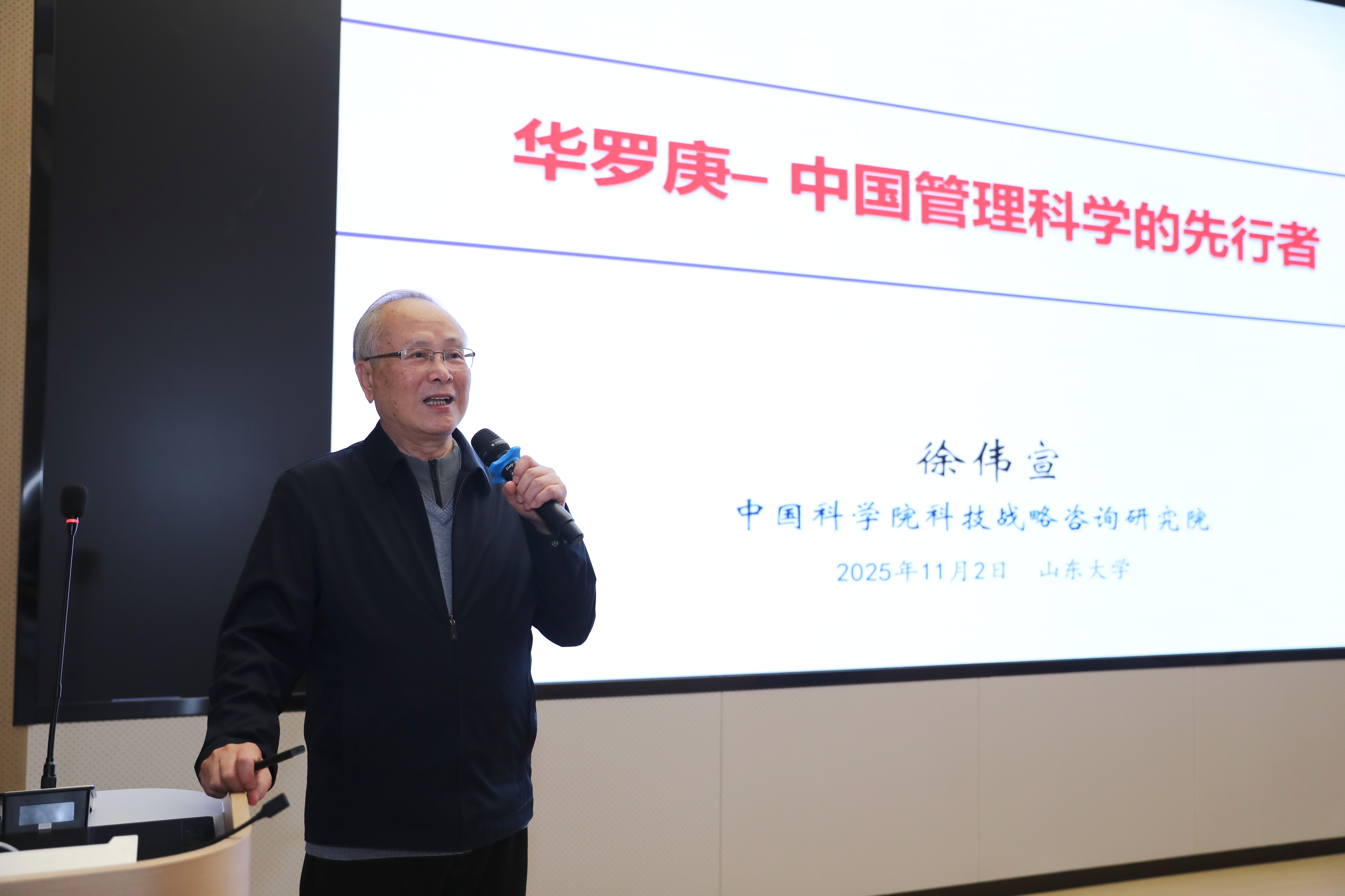 作为开幕式的重磅环节,大师讲坛邀请两位学界大咖带来前沿学术分享。徐伟宣研究员受邀以“华罗庚-中国管理科学的先行者”为题作大师讲坛学术报告,以深厚的学术积淀与生动的叙事风格,带领在场师生沉浸式重温华罗庚先生的学术风骨与家国情怀。报告中,徐伟宣研究员系统梳理了中国管理科学“萌芽、停滞、复苏、发展”四个阶段,分享华罗庚老先生传授优选法、统筹法的励志故事和创新精神,生动诠释了老先生“理论联系实际”的创新精神与“为国为民”的赤子之心。最后以“希望寄托在年青人身上”向在场研究生发出殷切寄语,鼓励研究生多想、多问、多结合实际,将个人科研理想融入国家发展大局。李海舰研究员受邀以“数据价值化的理论与实践”为题作大师讲坛学术报告,聚焦数字经济时代管理学科的前沿命题,为在场师生打开新的研究视野。报告中,李海舰研究员首先立足国家发展战略,指出数据价值化是引领发展新质生产力的核心引擎,深入剖析了数据价值化的理论与现实意义、认识数据价值化的难点所在,从宏观视野到微观洞察,深刻阐述了数据作为新型生产要素的价值实现路径。最后,他鼓励同学们以问题为导向,用专业能力为数字经济高质量发展贡献学术力量。两场报告内容深刻,赢得现场师生的热烈掌声。