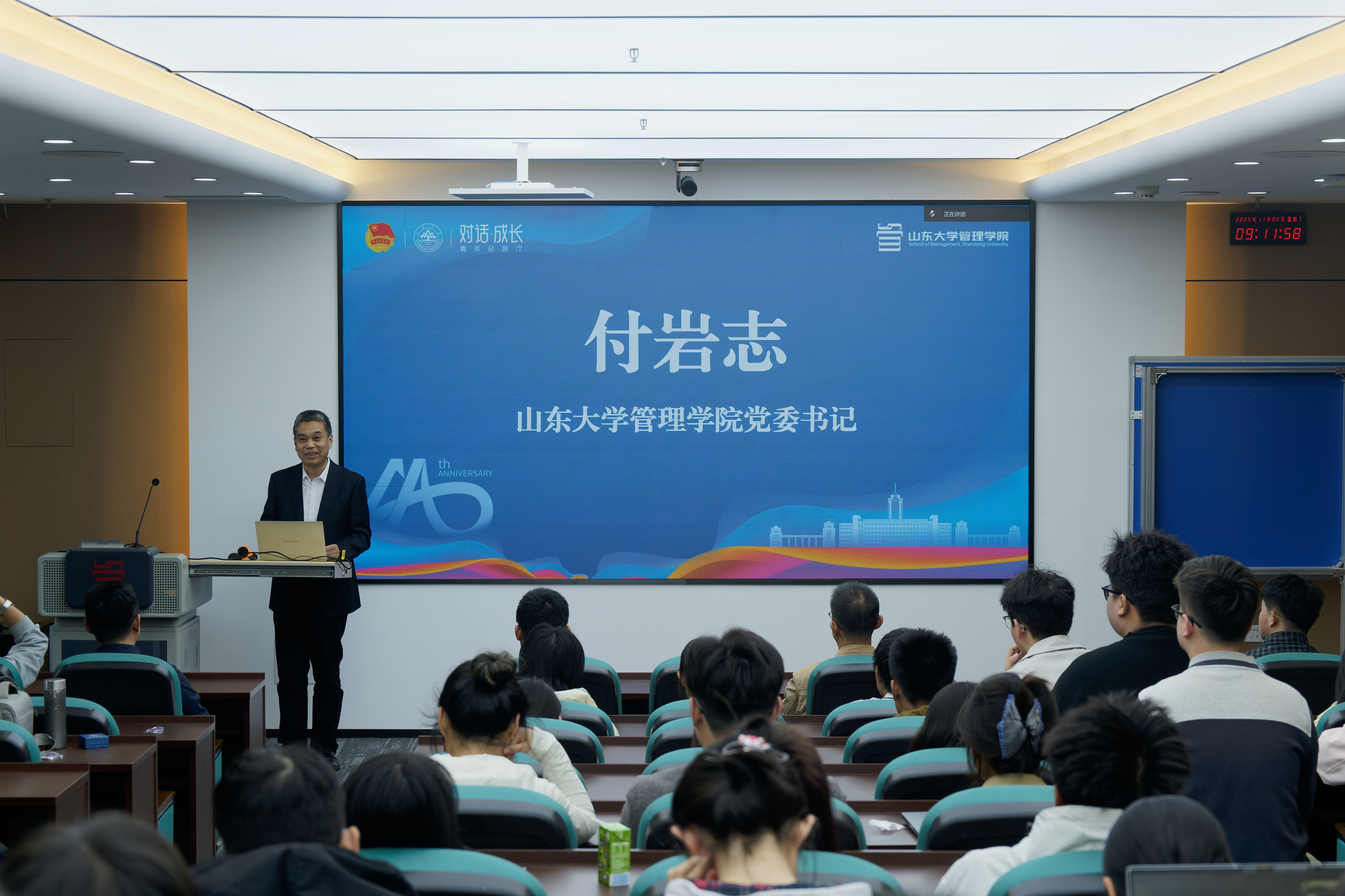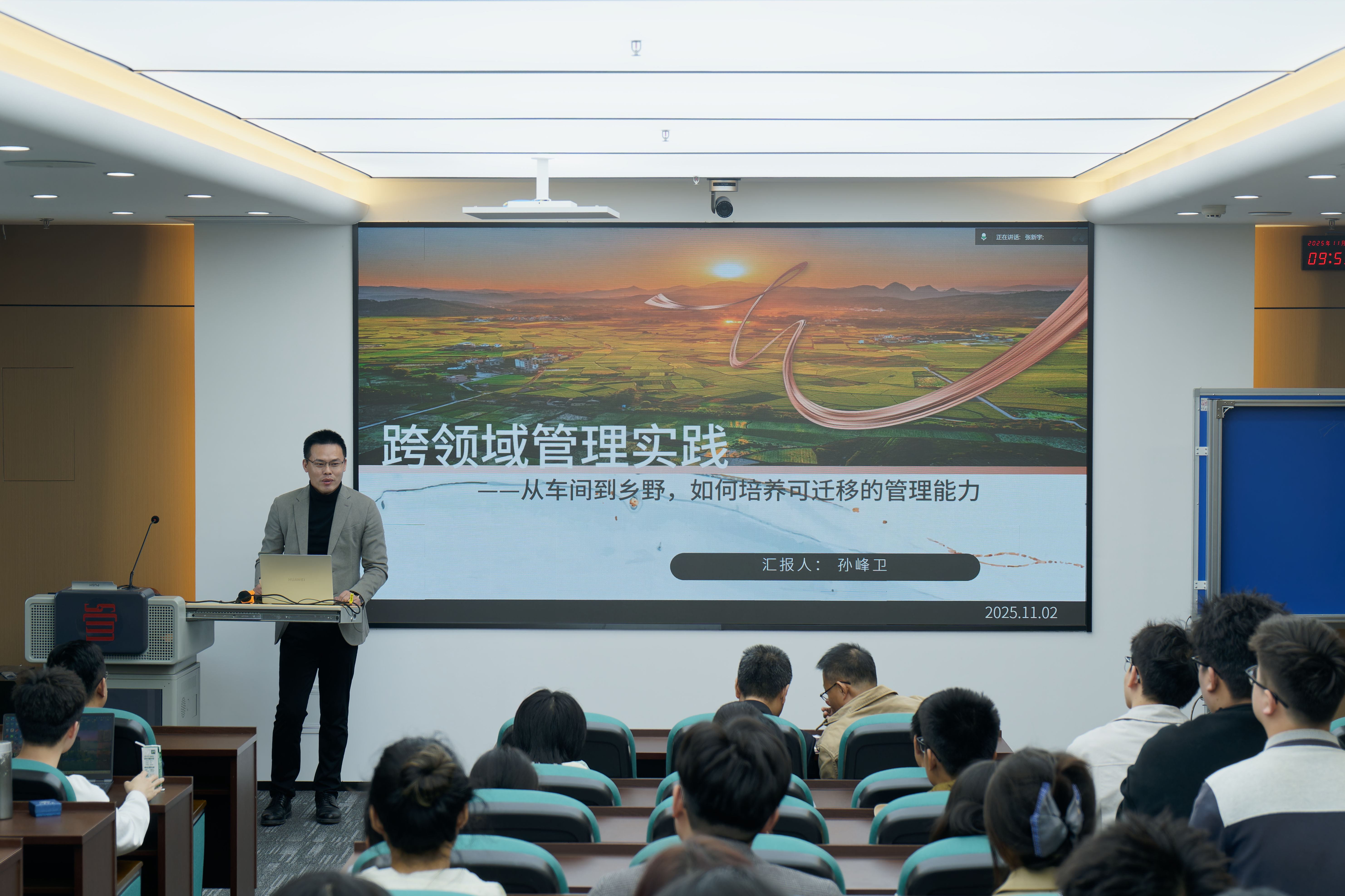 孙峰卫以《跨领域管理实践:如何培养可迁移的管理能力》为题展开分享。他结合自身在乡村振兴领域的丰富实践,阐述了如何将企业管理经验成功运用于乡村发展场景。通过全域土地综合整治等案例,孙峰卫系统介绍了以系统思维统筹项目、以流程优化提升效率、以数据驱动辅助决策、以人性化沟通推进落实的管理方法。他强调,管理的核心在于提炼各领域通用的思维模式,实现从“管理机器”到“服务人民”的理念转变,从而在不同领域中构建可持续的发展模式。最后,他勉励同学们要突破专业边界,在多样化场景中锤炼可迁移的核心能力,为未来承担更重要的社会责任做好准备。