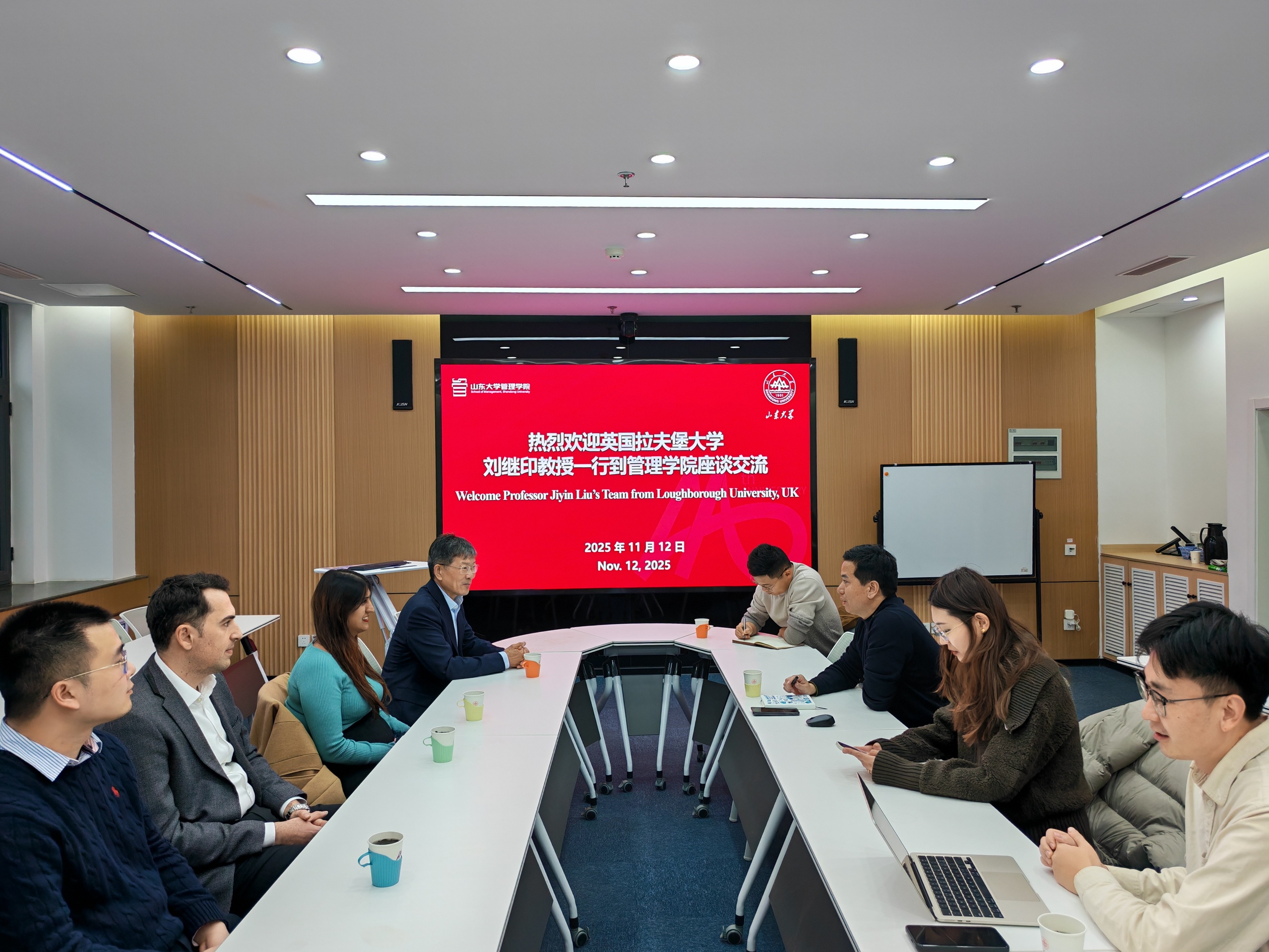 近日,英国拉夫堡大学(Loughborough University)刘继印教授、Rupal Mandania、Cihan Butun及博士生龚禹澈一行到访山东大学管理学院,围绕科研合作与学术交流开展座谈。山东大学管理学院副院长、教授张江华,副教授刘伟波,数据科学研究院助理研究员汲晨璐,管理学院博士后杨翔宇参加座谈。会议由张江华教授主持。