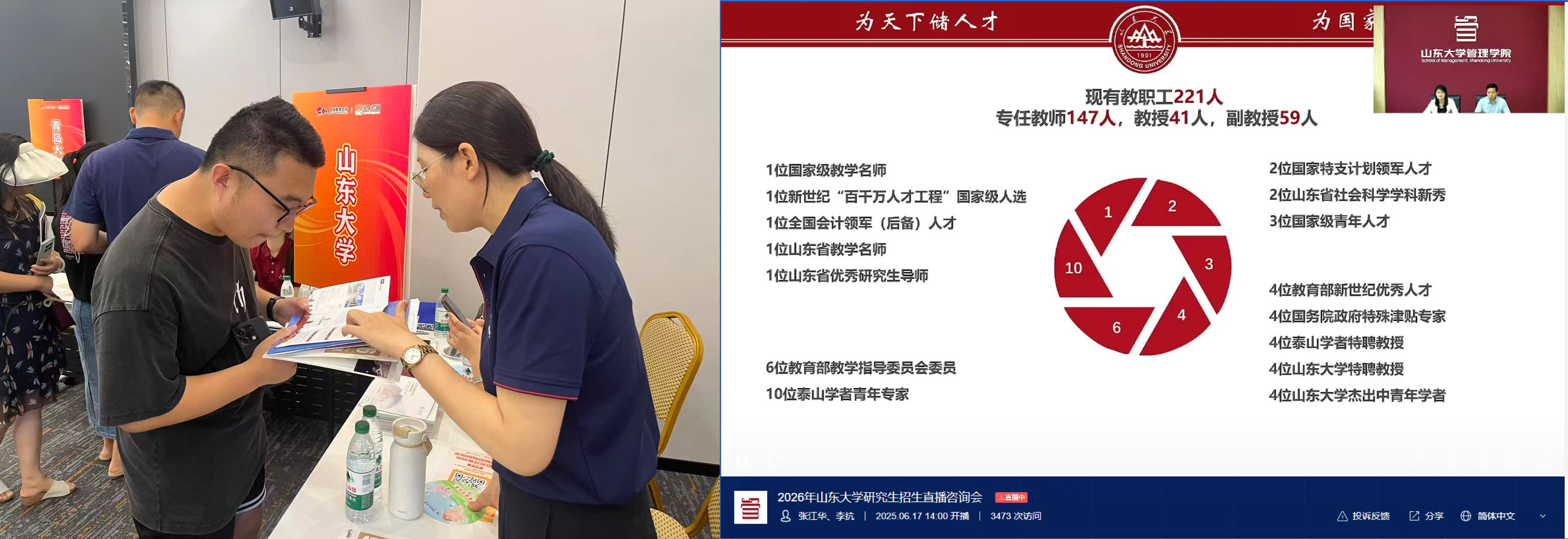此外,管理学院在招生前期开展了多种形式宣传活动。学院领导参与了学校组织的线上招生直播咨询会,系统介绍学院情况并与考生互动;研究生教育中心赴青岛参与全国研究生招生现场咨询会进行面对面宣讲,为考生答疑解惑,积累了有效的招生宣传经验。