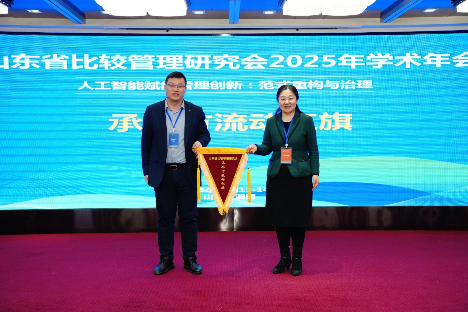 山东理工大学管理学院院长孙秀梅教授与聊城大学商学院院长梁树广作为代表交接山东省比较管理研究会承办方流动红旗。杨蕙馨为山东理工大学颁发2025年学术年会承办方纪念贡献奖牌并宣布会议闭幕。