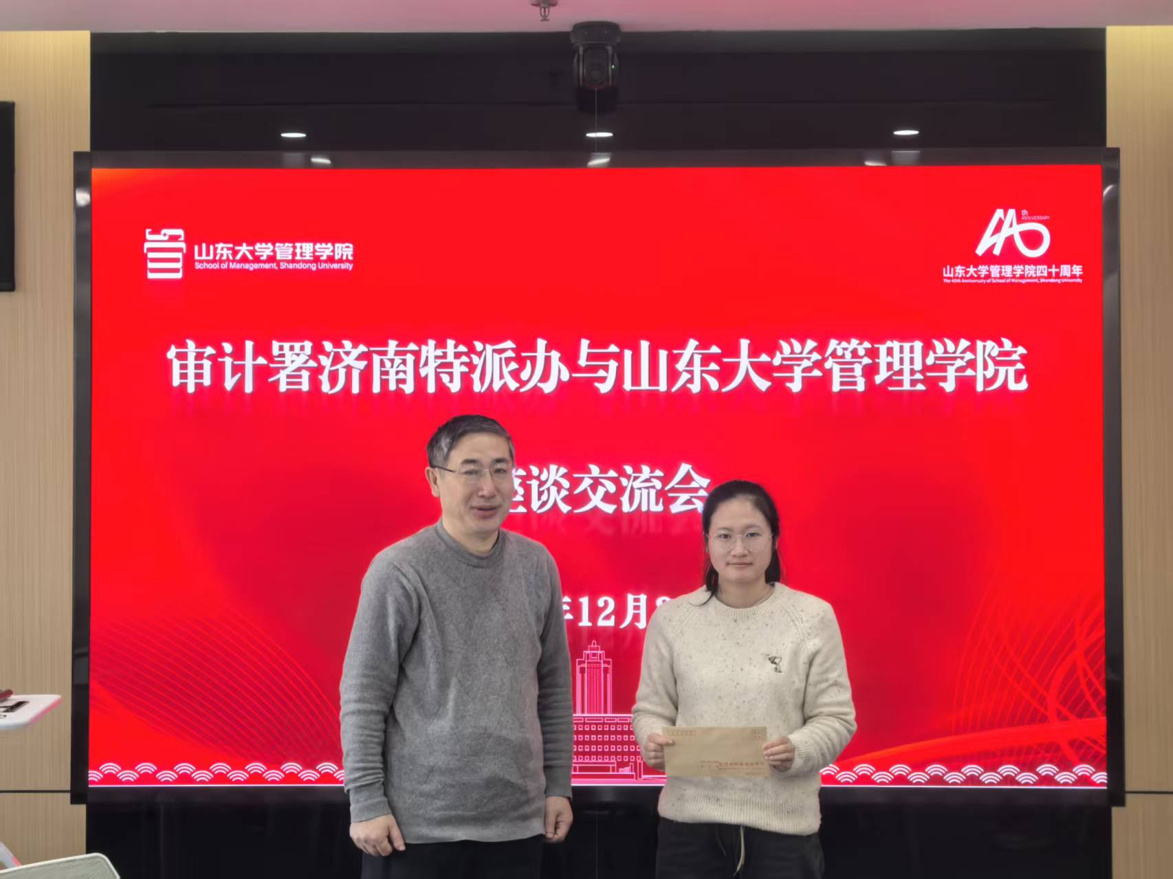 12月24日,山东大学管理学院与审计署济南特派办开展座谈交流。审计署济南特派办人事教育处处长、一级调研员王增华,三级调研员张洪萍,管理学院党委书记付岩志、党委副书记李抗参与座谈。