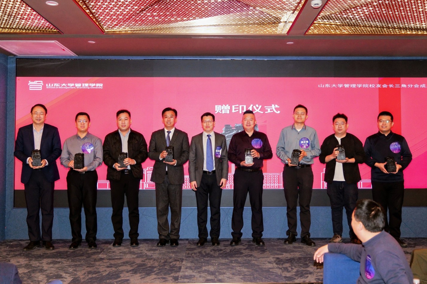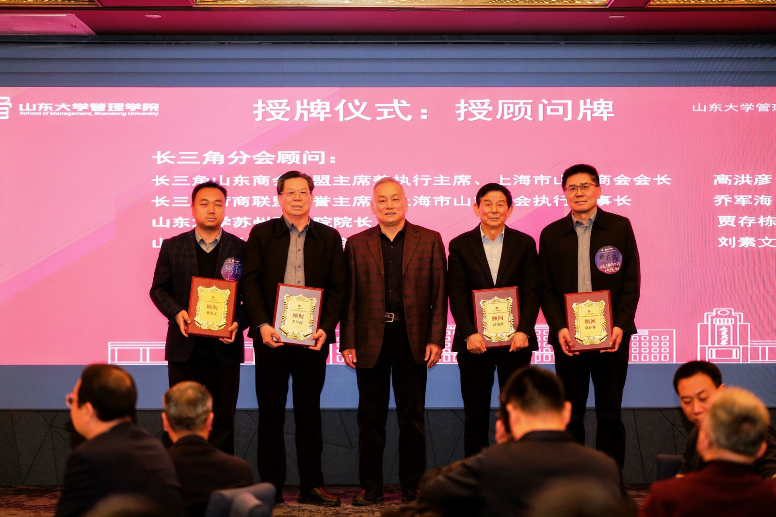 付岩志向长三角分会授旗,任新建接旗。丁荣贵为分会授予“校友之家”牌匾,长三角分会执行会长孙峰接牌。学院校友会常务副会长石清云、副院长张晓峰和学院校友办孙涛分别为长三角分会首届理事会成员授牌。长三角分会与上海市山东商会、德州分会等互赠墨宝与印章。