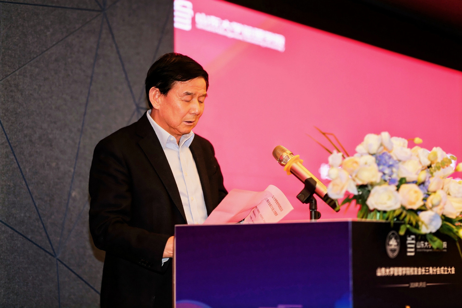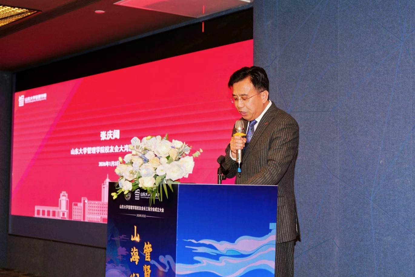 学院党委书记、校友会会长付岩志致开幕辞,回顾了山东大学自1901年开办商科教育以来的百年文脉,并指出,管理学院始终是广大校友心中“最懂文化、最能担当、最讲情义”的家园,期望长三角分会成为有温度、有力量的校友港湾。长三角山东商会联盟主席兼执行主席、上海市山东商会会长高洪彦致辞表示,上海市山东商会将作为坚强后盾,支持长三角校友企业家携手共进,共同续写管院人“激赏真价值”的新篇章。山东省人民政府驻上海办事处办公室主任李峰致辞,期待校友们充分发挥母校的智力支持,为鲁沪两地的经济文化交流贡献更多力量。