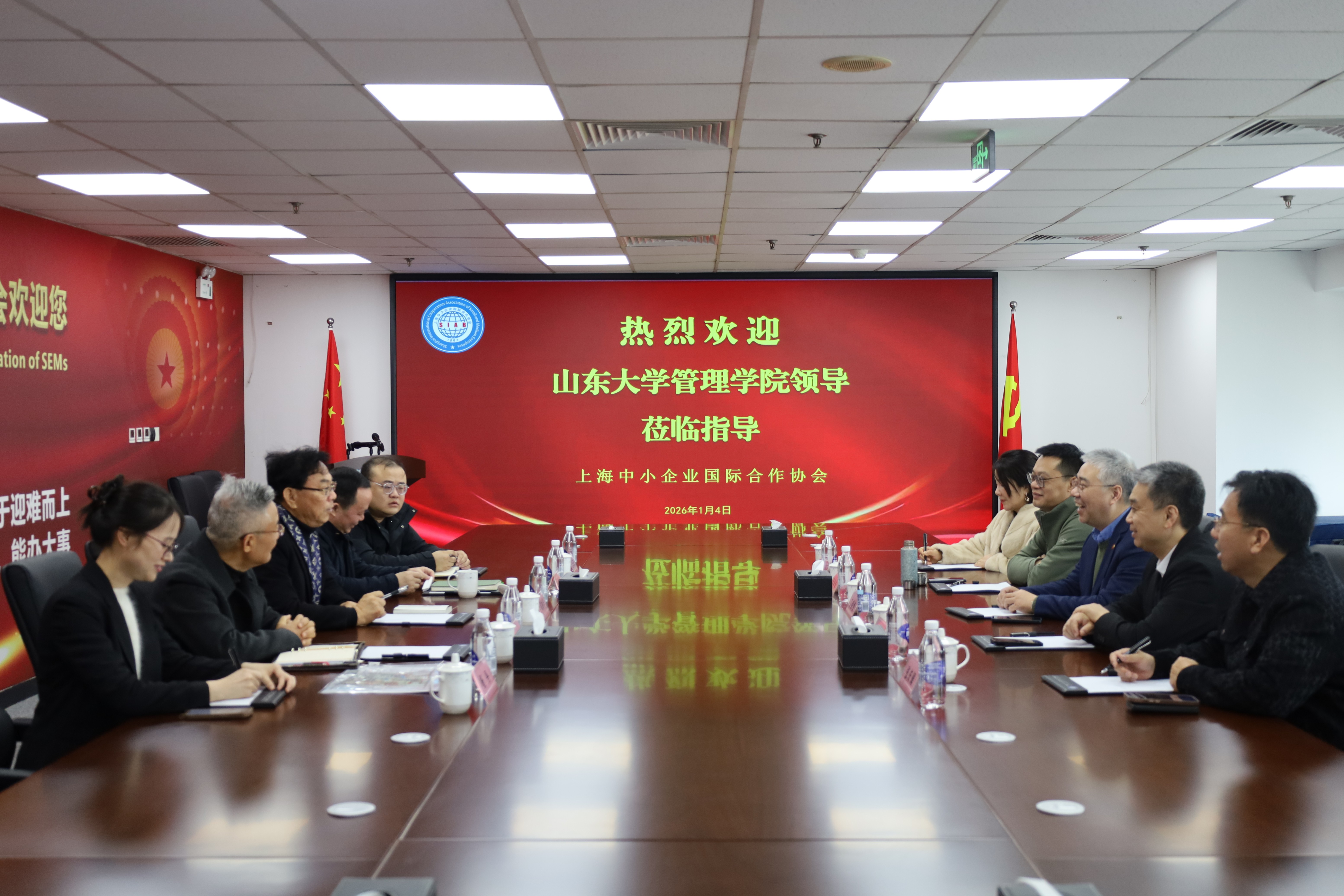 1月4日,山东大学管理学院一行赴上海中小企业国际合作协会座谈交流,双方围绕产教研合作、优质资源共享等议题深入探讨,为校协合作锚定方向。上海中小企业国际合作协会会长兼中国民营企业国际合作促进会名誉会长钱振华、常务副会长孙建龙、副会长任网银,爱华国际教育科技集团董事长张庆阔等,以及管理学院院长丁荣贵、党委书记付岩志、副院长张晓峰参与会谈。