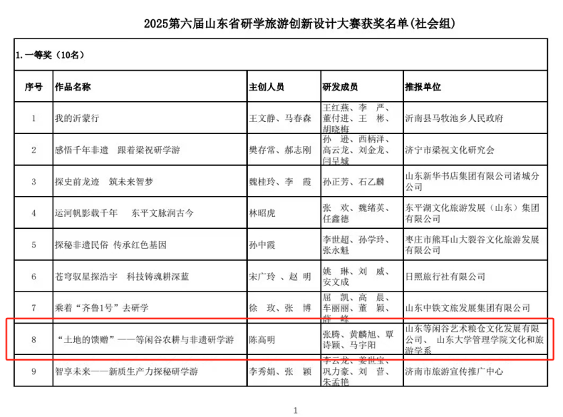 深化校地强联动,赋能乡村促振兴。2025年5月,“三零小院”山东大学乡村旅游辅导站在泗水县等闲谷艺术小镇正式揭牌,文化和旅游学系师生多次与等闲谷艺术小镇开展乡村振兴座谈与研学实践活动,深入助力等闲谷文旅研学资源的开发。在“三零小院”项目负责人、文化和旅游学系教工党支部书记孙平教授指导下,文化和旅游学系硕士研究生覃诗颖、黄麟旭、马宇阳作为主要研发成员与等闲谷联合打造研学作品《“土地的馈赠”——等闲谷农耕与非遗研学游》。课程立足于山东省泗水县等闲谷艺术小镇独特的文旅资源与生态背景,通过系统性、沉浸式、多感官的学习方式,引导学生从土地出发,理解自然,文化与生活之间的深刻联系,培养其动手能力、跨学科思维、团队协作精神与社会责任感。该课程在第六届山东省研学旅游创新设计大赛中,从6360余件参赛作品中脱颖而出,获得“2025第六届山东省研学旅游创新设计大赛(社会组)一等奖”,展现了“三零小院”项目助推乡村辅导主体发展的实践成效。该比赛由山东省文化和旅游厅、山东省总工会、山东省教育厅、山东省农业农村厅、山东省绿色低碳高质量发展先行区建设领导小组办公室、山东省精品旅游促进会共同主办。
