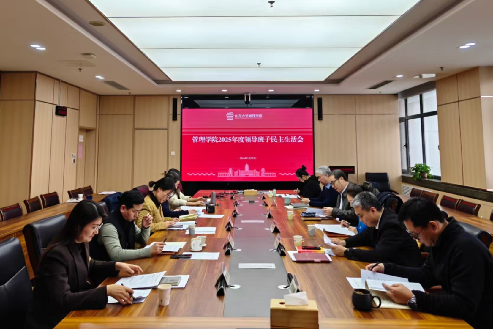 按照学校党委部署要求,1月19日下午,山东大学管理学院召开2025年度领导班子民主生活会。会议深入学习贯彻习近平新时代中国特色社会主义思想,认真落实党的二十届四中全会精神,聚焦主题,结合思想与工作实际,进行自我检视、党性分析,开展批评和自我批评。学校党建考核第二组组长郭举修、组员赵婧婧到会督导。学院党委书记付岩志主持会议,院长丁荣贵及领导班子成员参会。