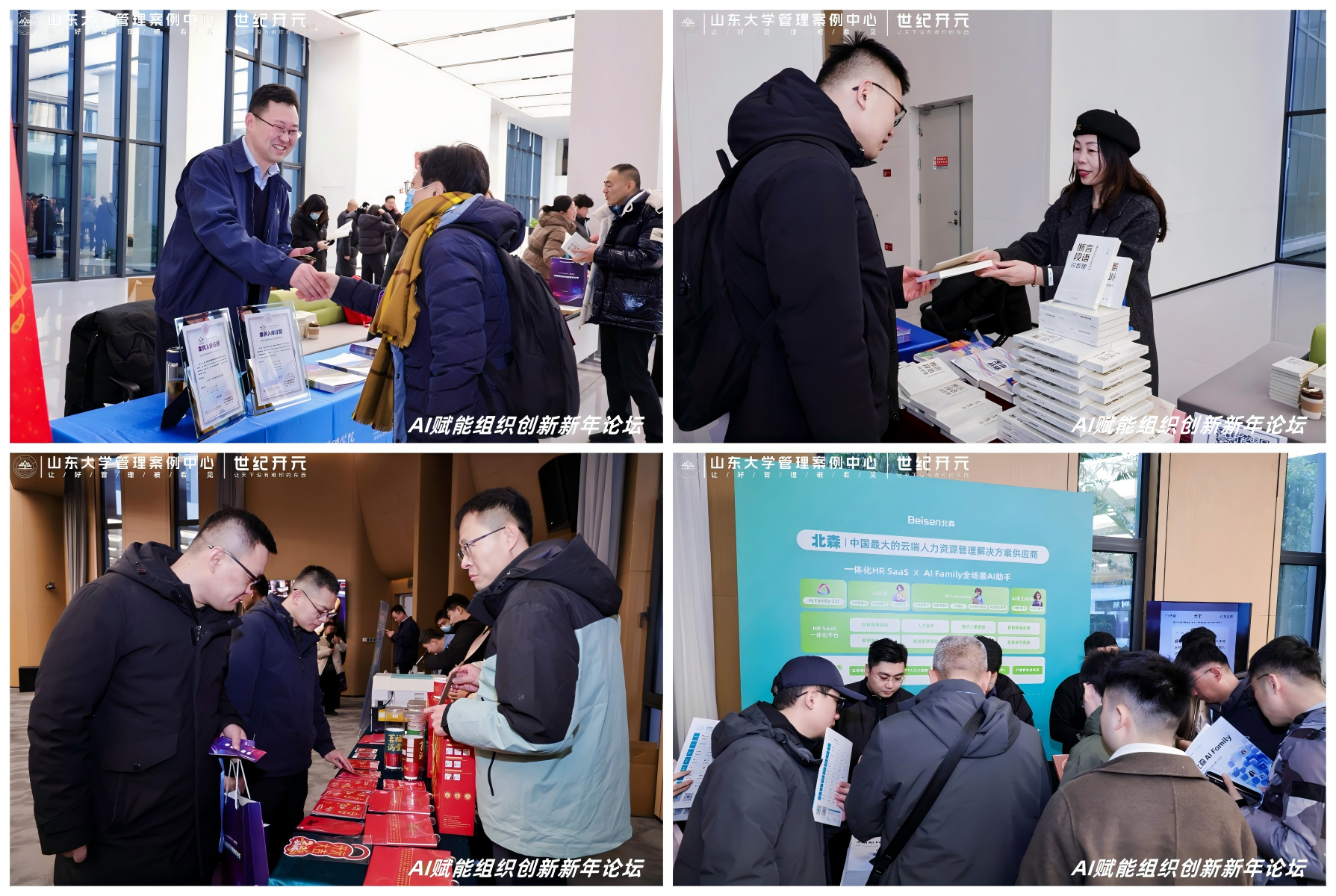 会场特设多个主题展台,构建起理论与实践深度互动的体验空间。清华大学经济管理学院中国工商管理案例中心与山东大学管理案例中心集中展示了前沿管理教学研究成果与本土企业创新实践案例;世纪开元展台以AI设计、即时印刷的沉浸式体验,生动演绎了个性化定制与智能生产的融合;北森控股有限公司则通过场景化的领导力互动测评,让参会者直观感受AI在人才发展与组织管理中的赋能价值。多元展台形成了“研、产、教、用”联动的一站式交流场景,成为论坛现场思想碰撞与生态连接的重要触点。
