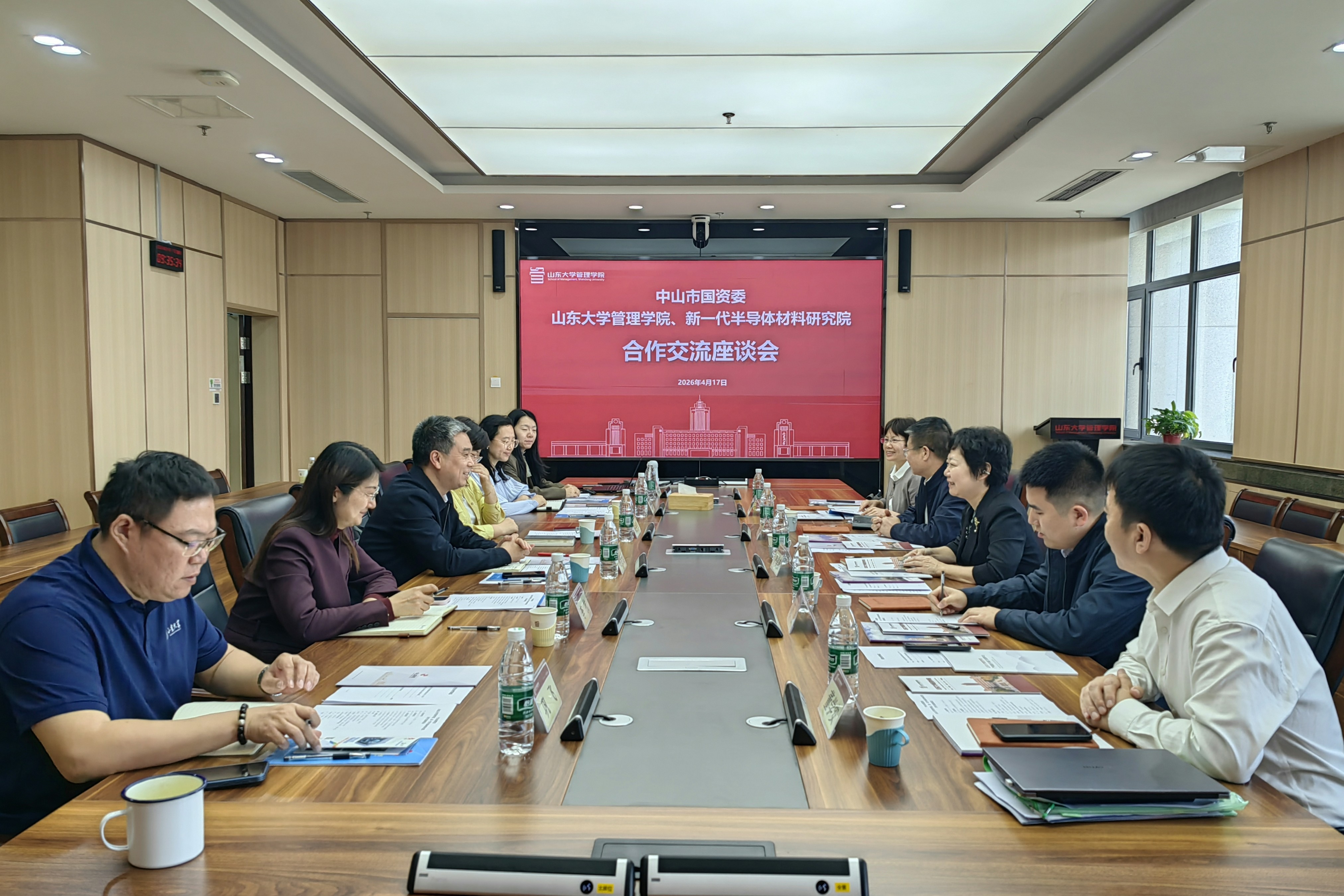4月17日上午,中山市国资委及企业一行到访山东大学管理学院,与管理学院、新一代半导体材料研究院开展合作交流座谈。中山市国资委党委委员、副主任严美燕,市委组织部人才科科长周伟、投资控股集团董事郭洋、投资控股集团人力资源部总经理董学安、兴中能源副总经理龙雅娜;山东大学新一代半导体材料研究院常务副院长陈秀芳,管理学院党委书记付岩志、党委副书记李抗参与座谈。