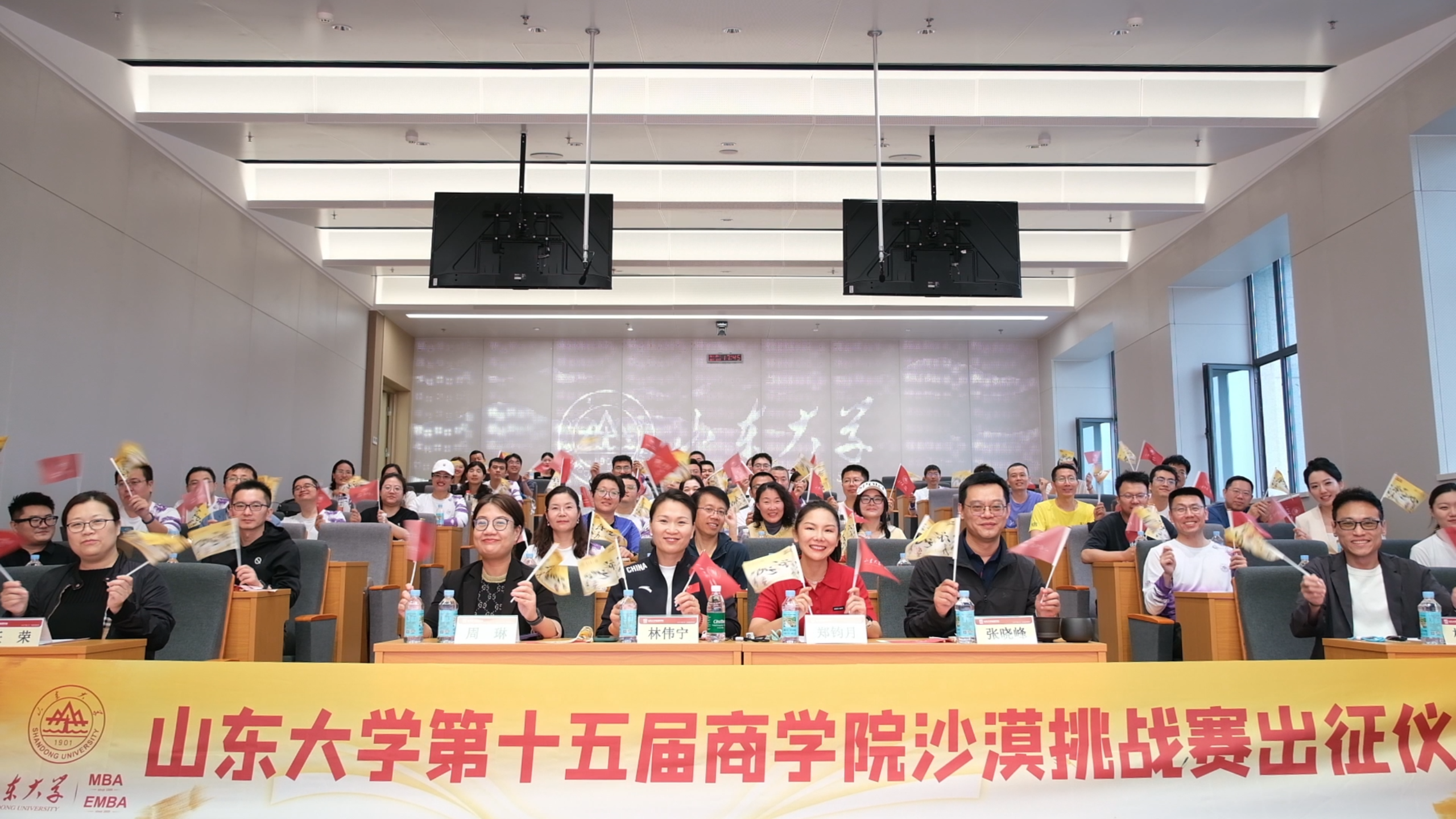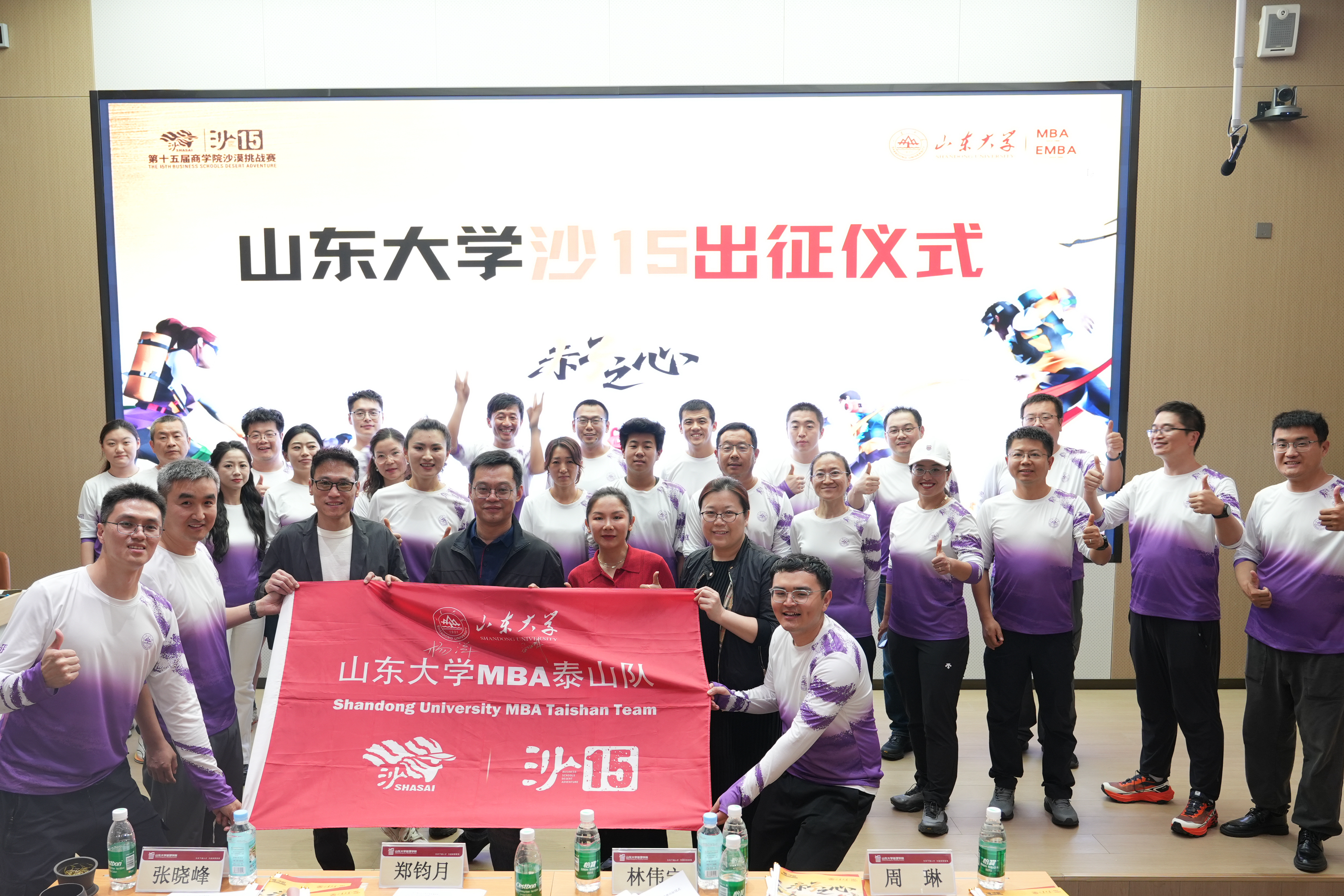 4月26日晚,山东大学第十五届亚太区商学院沙漠挑战赛出征仪式在中心校区举行。山东省体育科学研究中心(省反兴奋剂中心)党总支书记、主任,第27届悉尼奥运会女子举重冠军林伟宁,2025年八百流沙极限赛女子组卫冕冠军郑钧月;山东大学管理学院党委副书记周琳,副院长、MBA/EMBA教育中心执行主任张晓峰,MBA/EMBA教育中心副主任任荣等出席仪式。沙15全体队员、往届沙友代表及MBA/EMBA师生齐聚现场,传承山大精神,砥砺出征之志。