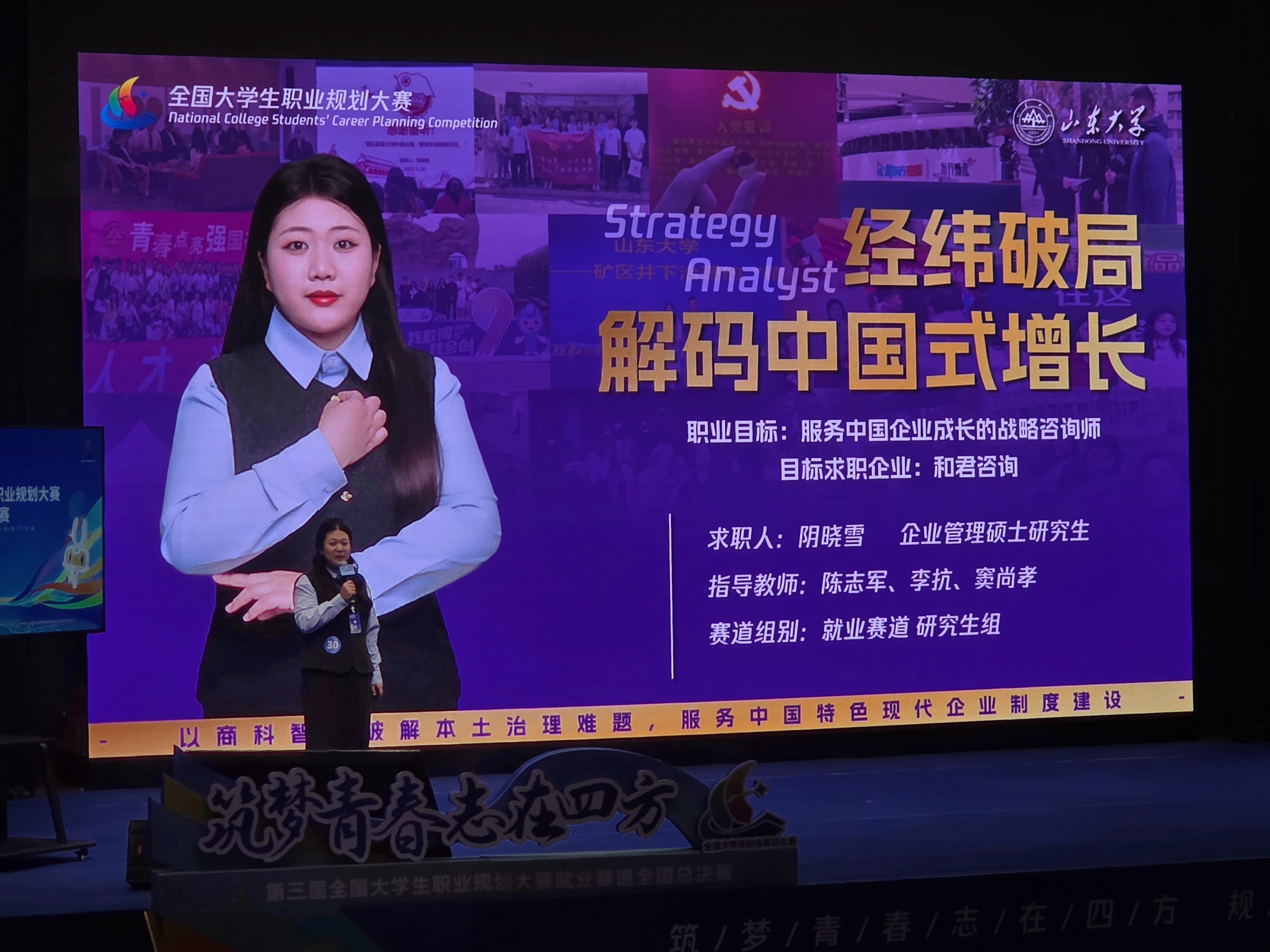 第三届全国大学生职业规划大赛由教育部与天津市人民政府共同主办,旨在强化高校学生职业规划意识,促进高校毕业生高质量充分就业。阴晓雪以成为一名服务中国企业成长的战略咨询师为职业目标,在比赛中以其清晰的职业目标、扎实的专业分析、可行的实施路径以及富有感染力的现场展示,赢得了评委的高度认可,在决赛中脱颖而出。阴晓雪在回顾参赛历程时表示:“职业规划是一场持续与自我的对话——在不断追问‘我想成为谁’、‘我能创造什么价值’的过程中,逐步走向不可替代的自己。职业规划大赛始终贯穿两条育人逻辑:一是可复制的成长路径,让一个人的探索成为一群人的阶梯;二是将个人发展融入国家与社会需求之中。就业不仅关乎个人前程,更在于无数微小贡献的汇聚,正是这些力量构筑了社会主义现代化强国最坚实的基底。中国企业的成长需要本土智慧,我们的职业坐标,就应锚定在国家最需要回答的课题上。”